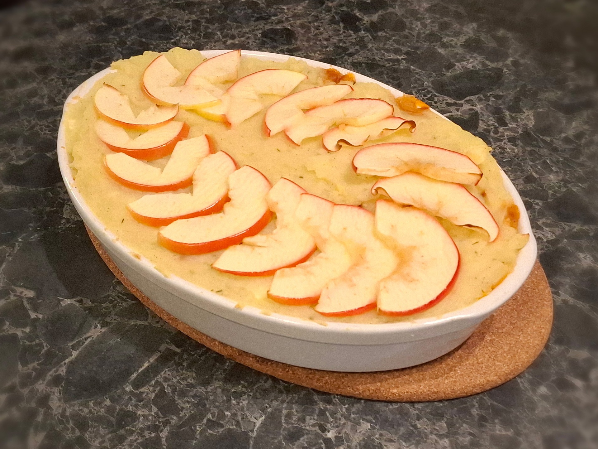 Maak met de aardappelen, de melk, de boter en een beetje zout en peper een gladde puree. Schil een appel en snijd het vruchtvlees in blokjes. Meng deze blokjes door de puree en verdeel deze over het gehaktmengsel.