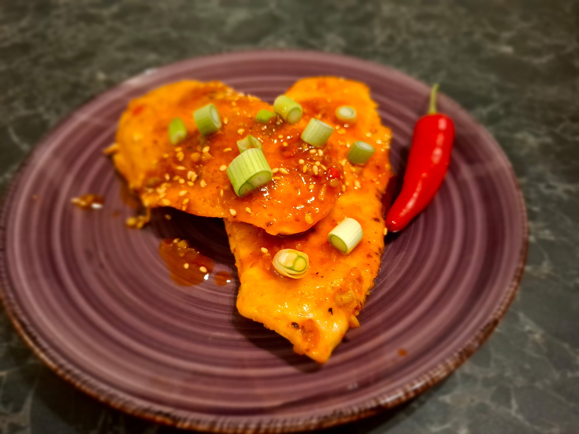- Maak nu de saus. Laat de pan heel even iets afkoelen. Doe de sesamolie in de pan en fruit hierin de knoflook en gember circa 15 seconden. Voeg de chilivlokken toe en bak nog eens 30 seconden door.2 tl sesamolie, 2 teentje knoflook, 5 cm gember, 1 rode peper