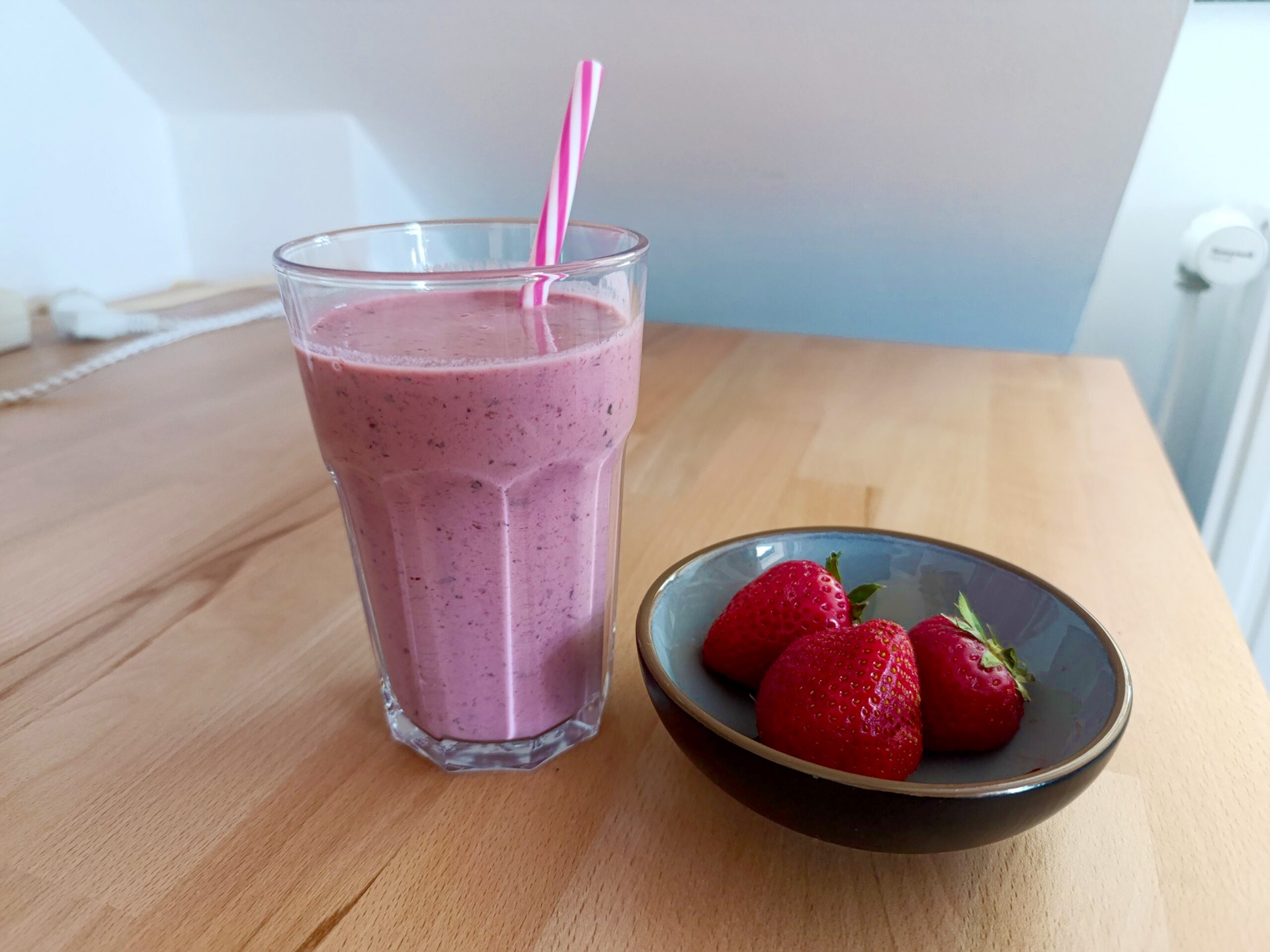 - Doe alle ingrediënten in een hoge kom en maal met een staafmixer tot een gladde smoothie. Eventueel kun je nog wat melk of water toevoegen als je de smoothie iets te dik vindt.250 gr bramen, 250 gr frambozen, 2 bananen, 250 ml (griekse) yoghurt