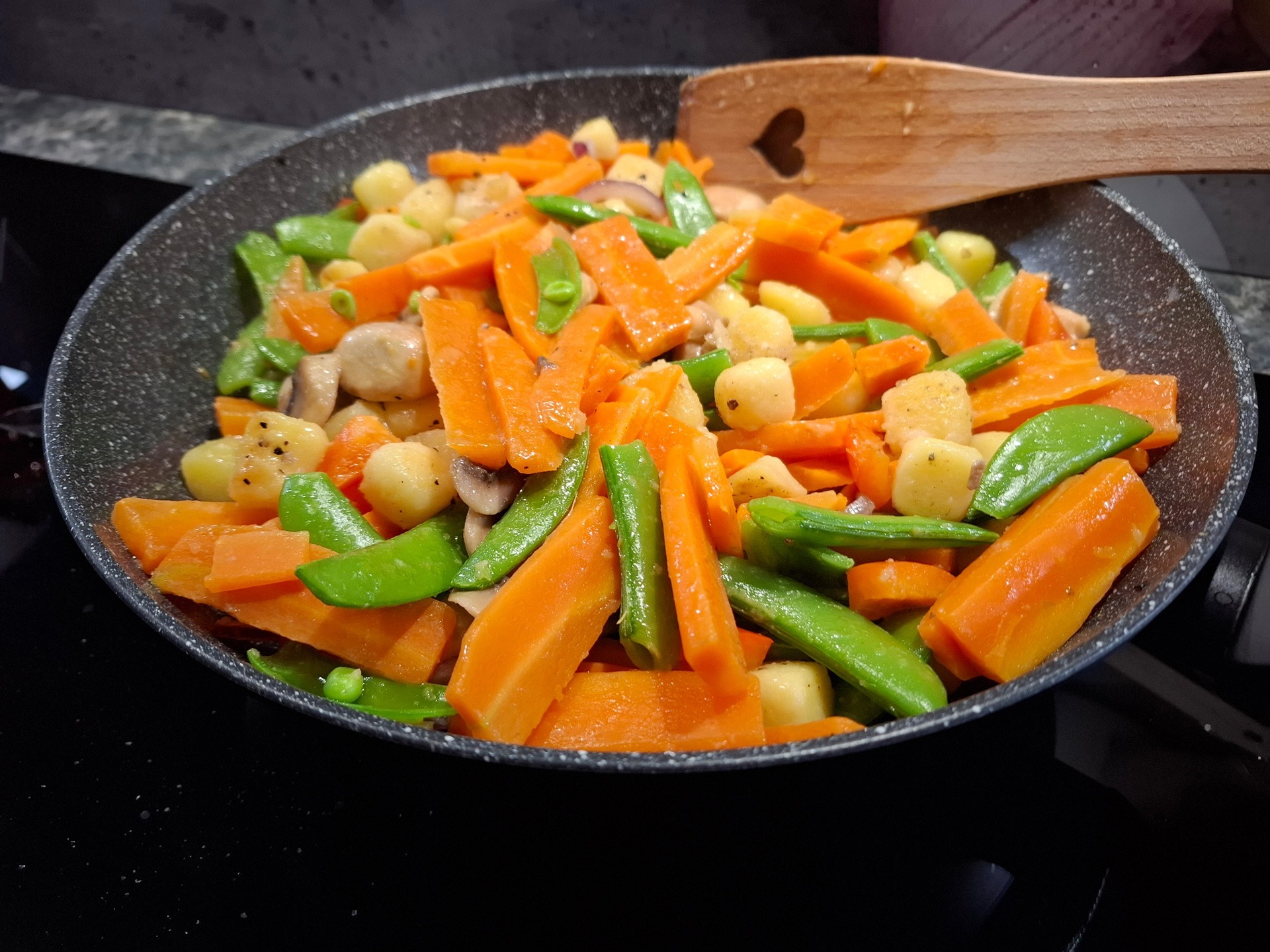 4 wortels, 200 gr sugarsnaps of peultjes, 400 gr krieltjes