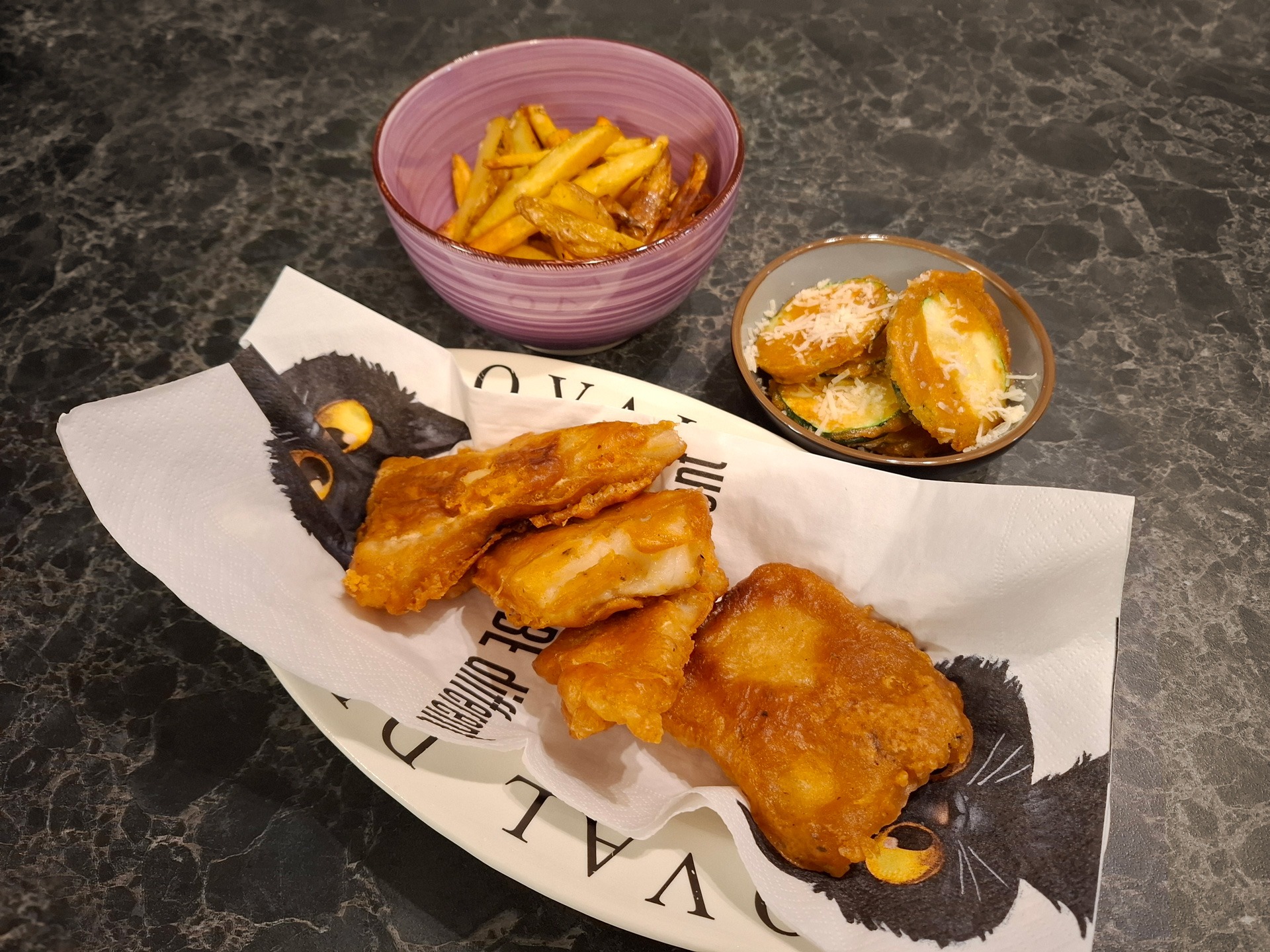 Indien je de groente erbij wilt: Snijd de courgette in schijven en dompel deze in het overgebleven beslag. Bak ze in dezelfde olie tot ze knapperig worden. Bestrooi vlak voor het serveren met Parmezaanse kaas.