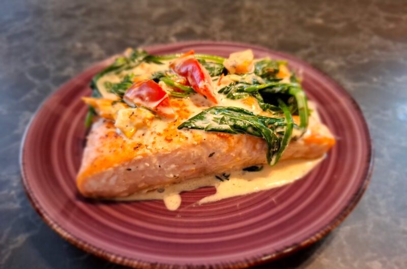 Zalmfilet in een gegrilde paprika-spinazie roomsaus