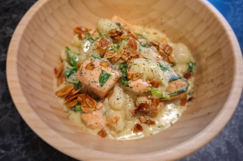 Stoofpotje met zalm, gnocchi en spinazie