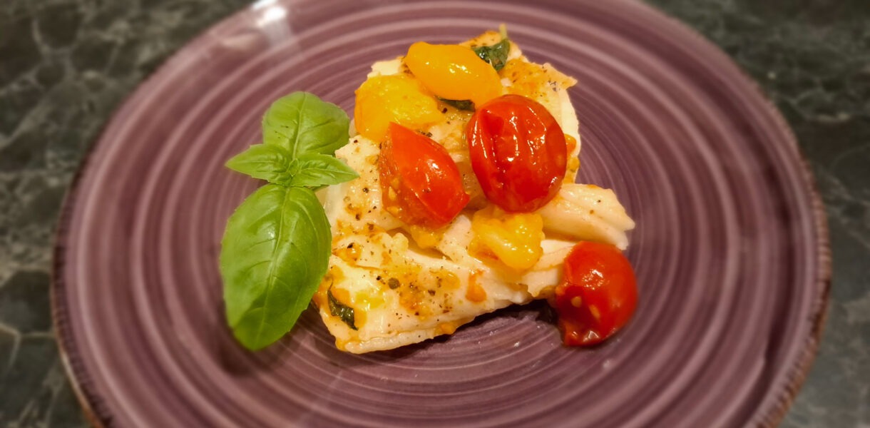 Kabeljauw in witte wijn-tomaten-basilicumsaus