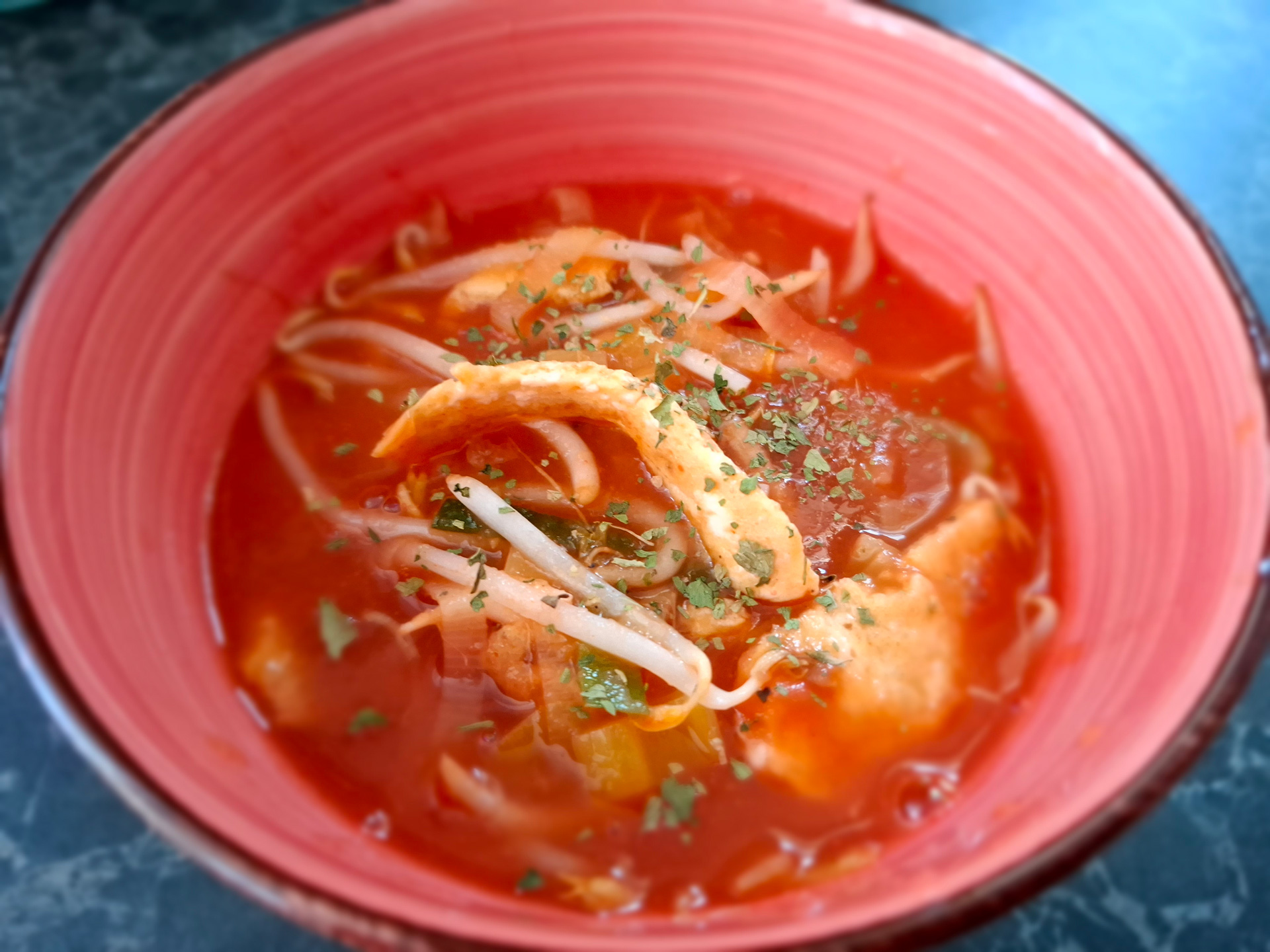 - Bak ondertussen een omelet van de eieren en snijd deze in reepjes. Voeg de omeletreepjes, samen met de taugé, toe aan de bouillon.6 eieren, 200 gr taugé