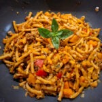 Snijd de uitjes in stukjes en de paprika’s in halve repen. Bak deze met de boter in een pan en strooi er kardemompoeder overheen. Voeg de rijst toe en bak deze totdat het er glazig uitziet. Roer er vervolgens de bouillon doorheen en laat dit op een klein vuur 25 minuten stoven.