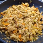 Leg op het bord eerst het rijstmengsel en daarna de kipfilet in schijfjes gesneden erbovenop. Gebruik eventueel nog wat koriander om te garneren.