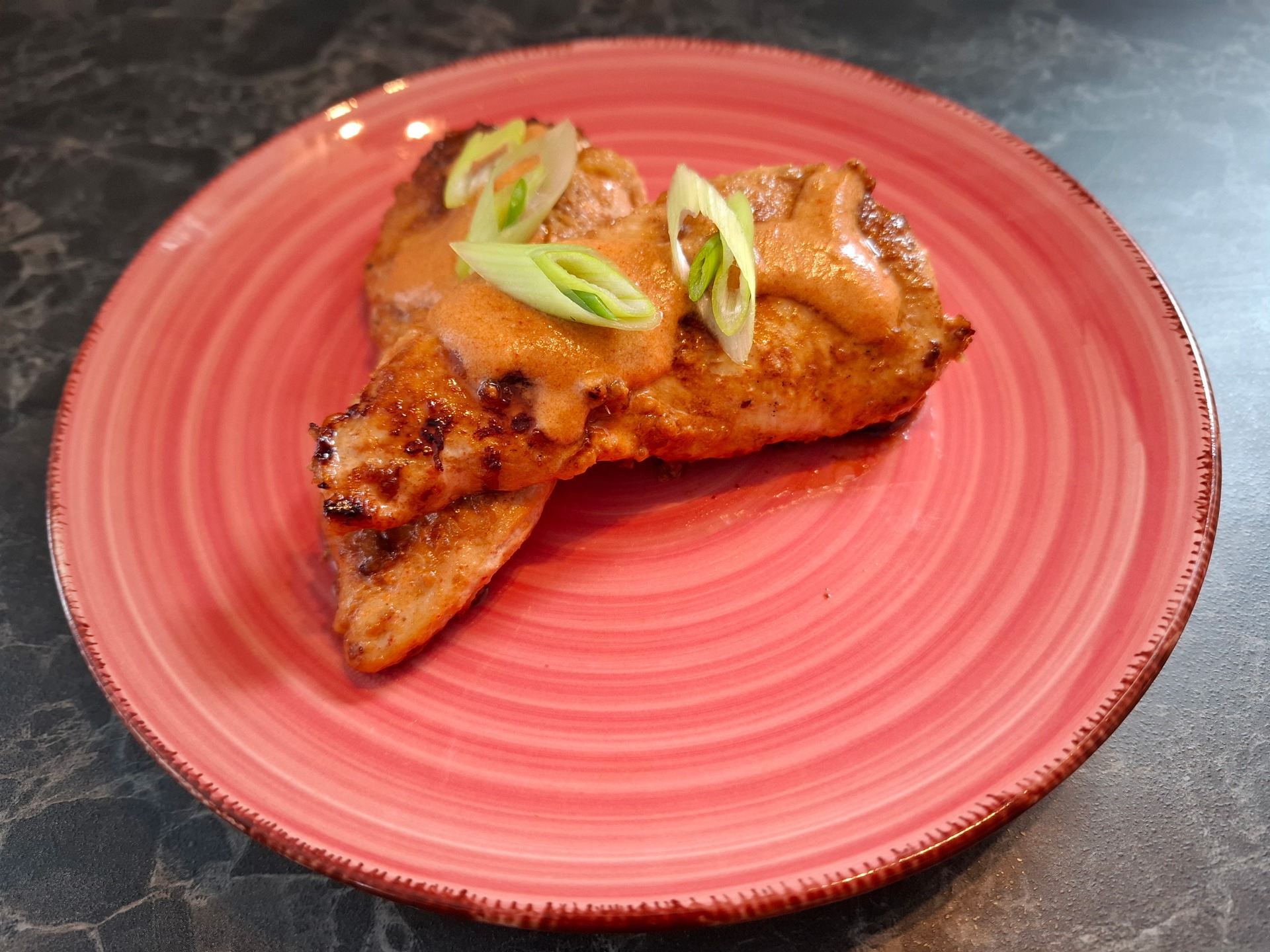 Verwarm de resterende marinade in een kleine pan tot deze warm is. Serveer de kip en sprenkel de saus erover. Bestrooi met groene uien, indien gewenst.