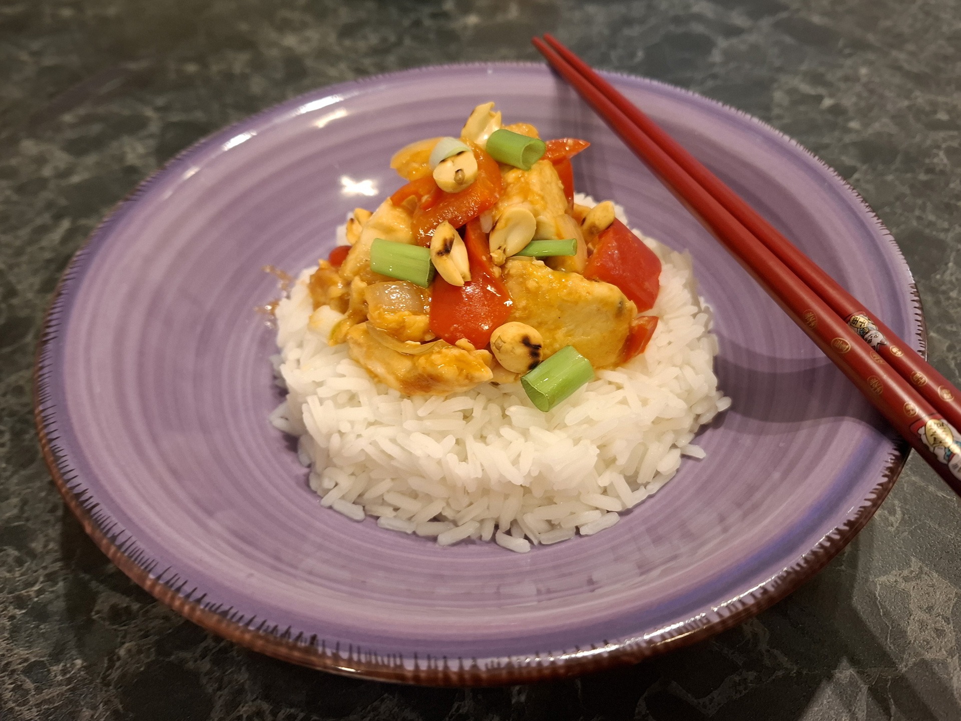 Doe de kip in de saus en roer goed door. Laat het geheel een paar minuten sudderen, zodat de saus iets inkookt. Bestrooi met de pinda’s en de bosuitjes en serveer met witte rijst, mie, miehoen of noedels.