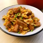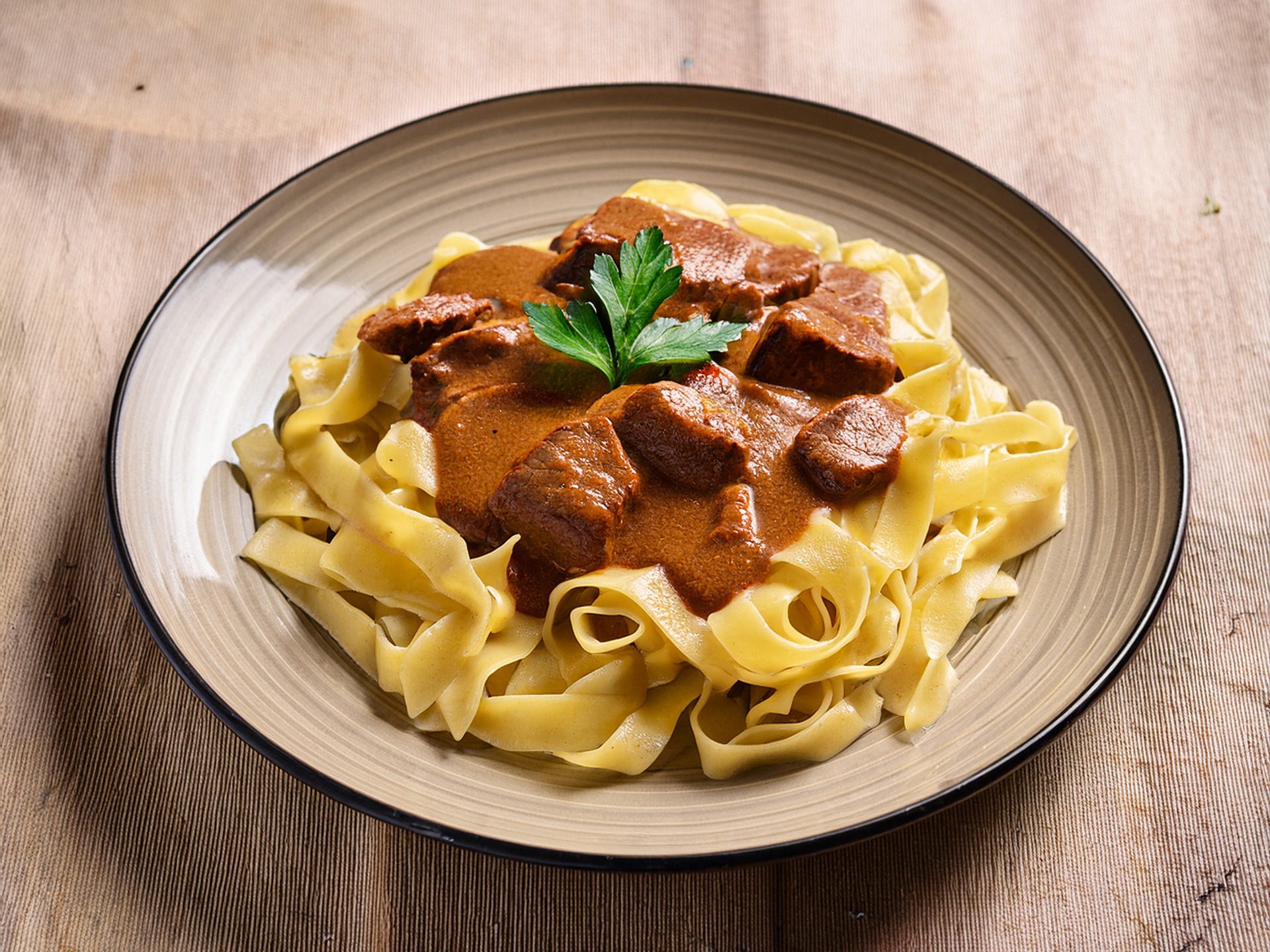 - Leg de deksel schuin op de pan en sudder zachtjes 2 uur op laag vuur. Kook ondertussen de tagliatelle of pappardelle volgens de aanwijzingen op de verpakking. Giet af en roer er een beetje boter doorheen. Roer na 2 uur de zure room en platte peterselie door de goulash en serveer met de pasta.120 ml zure room, Papardelle of Tagliatelle