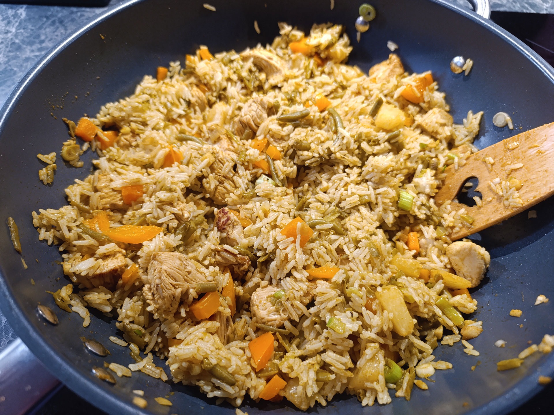 1 gele paprika, 200 g sperziebonen, 200 g ananasstukjes, 300 g rijst, 500 ml kokoswater, ca. 500 – 600 ml kippenbouillon