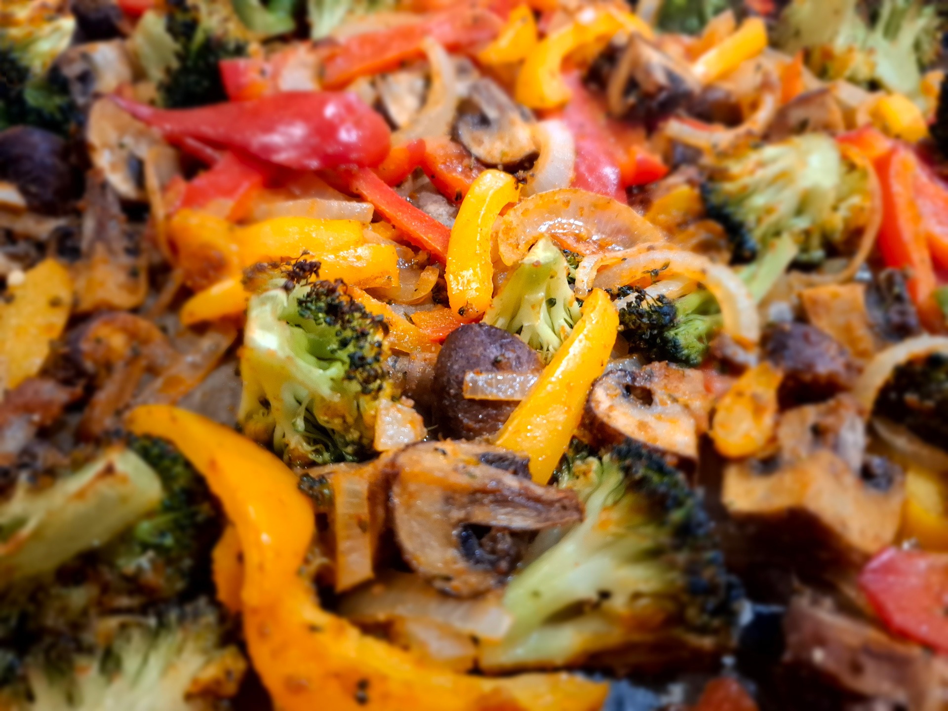 - Doe de groentes in een grote kom en schenk het kruidenmengsel eroverheen. Hussel de groentes goed door elkaar, zodat de marinade er goed over verdeeld is.3 paprika’s, 1 ui, 2 portobello paddenstoelen, 1 broccoli
