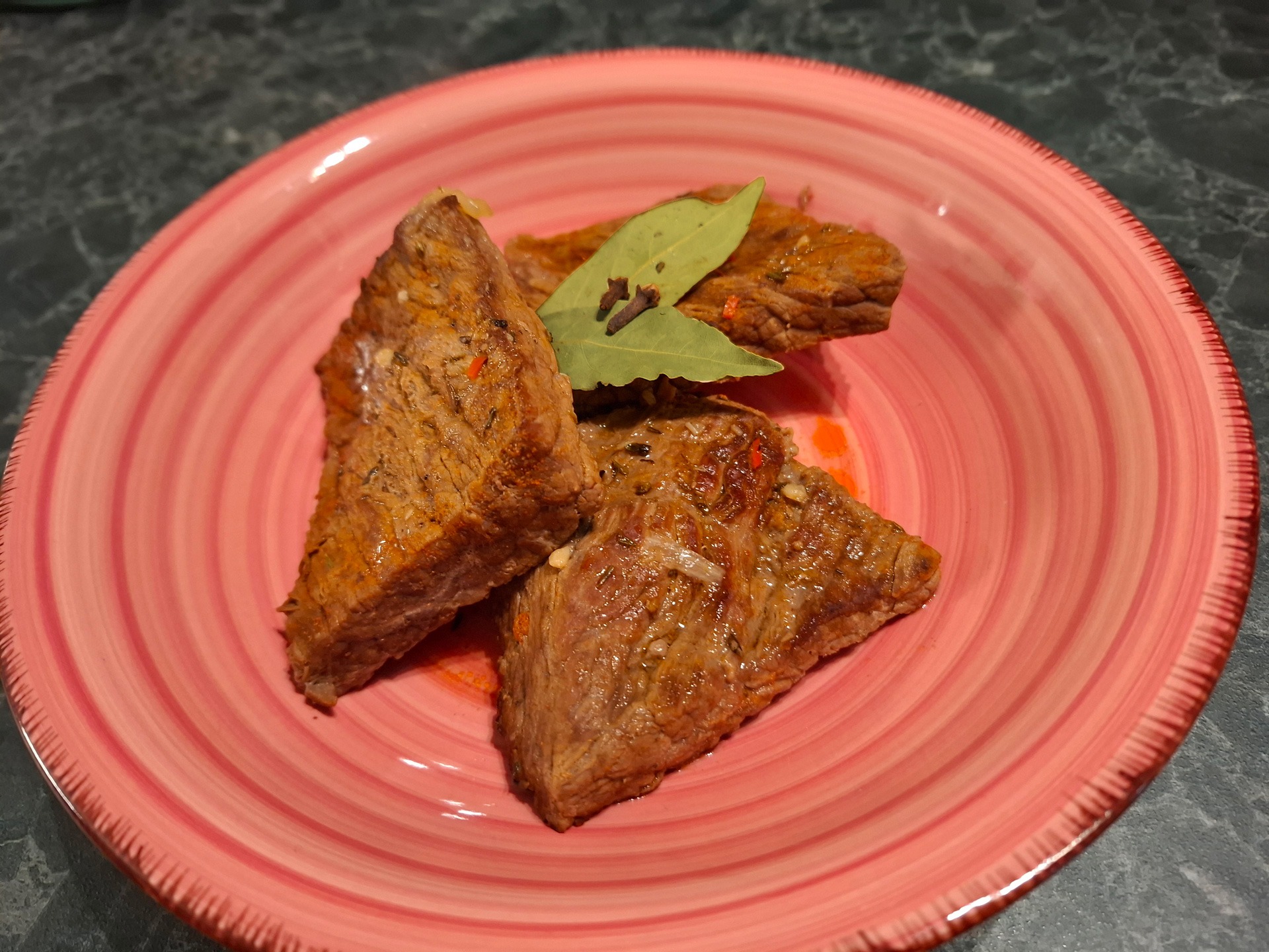 - Verhit wat olie of boter in een grote pan. Bestrooi de riblappen rondom met peper, zout en gerookt paprikapoeder en braad ze rondom mooi bruin. Haal de riblappen uit de pan en leg op een bord..1 kilo runderlappen
