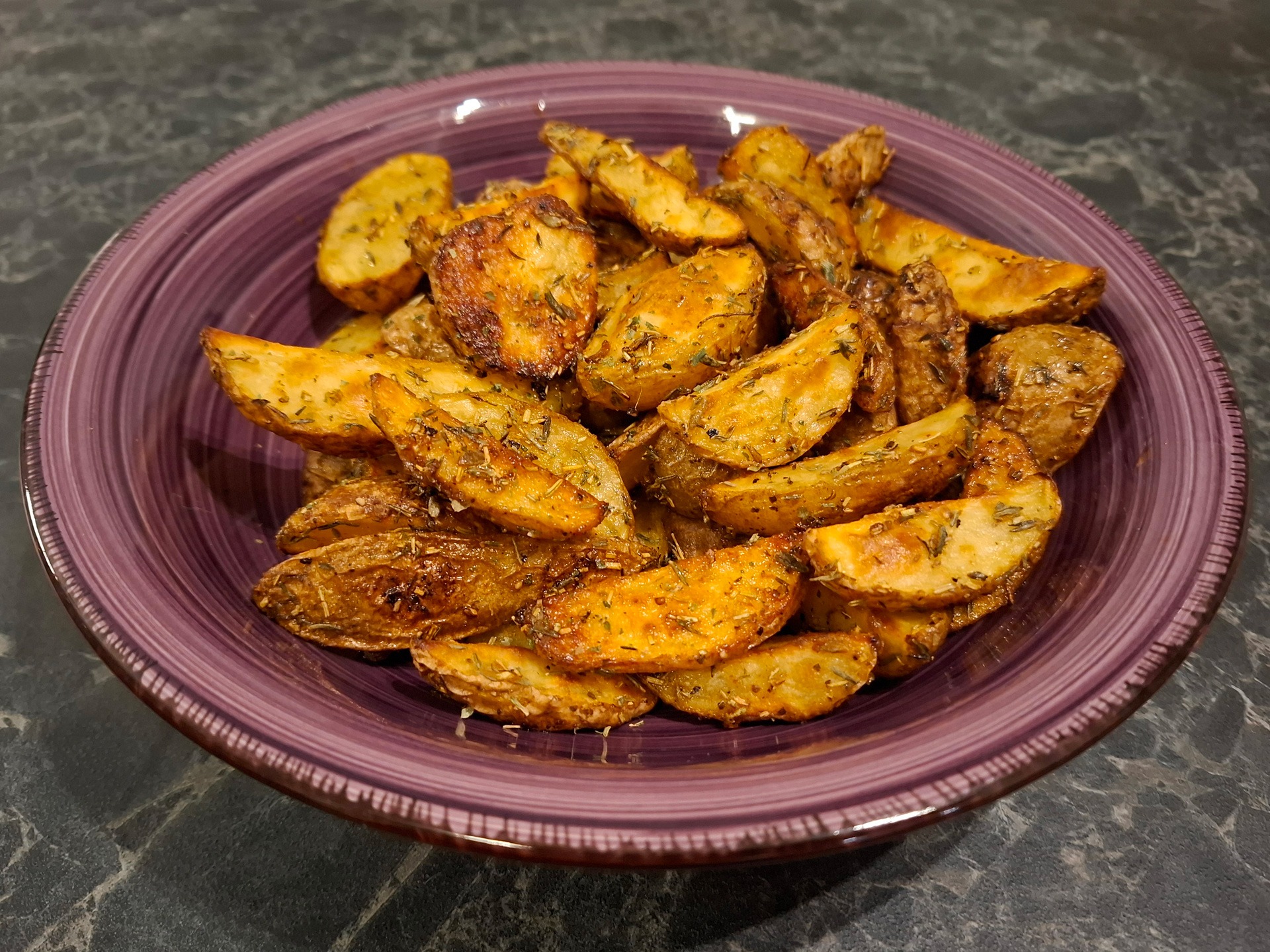 • Leg de aardappelpartjes op een met bakpapier bedekte bakplaat en zet ze 20 – 25 minuten in de oven, totdat ze praktisch gaar zijn.