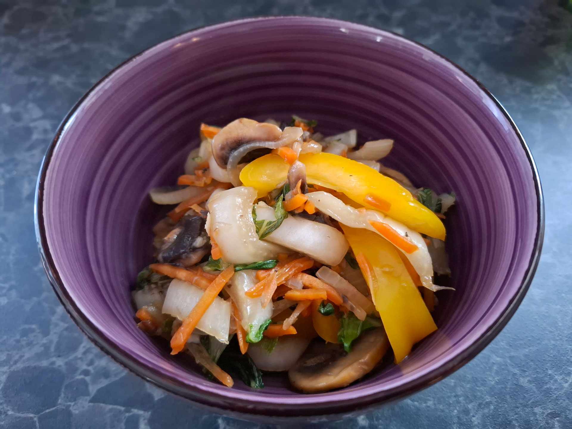1 wortel, 1 paksoi, 1 paprika, 250 gr kastanjechampignons