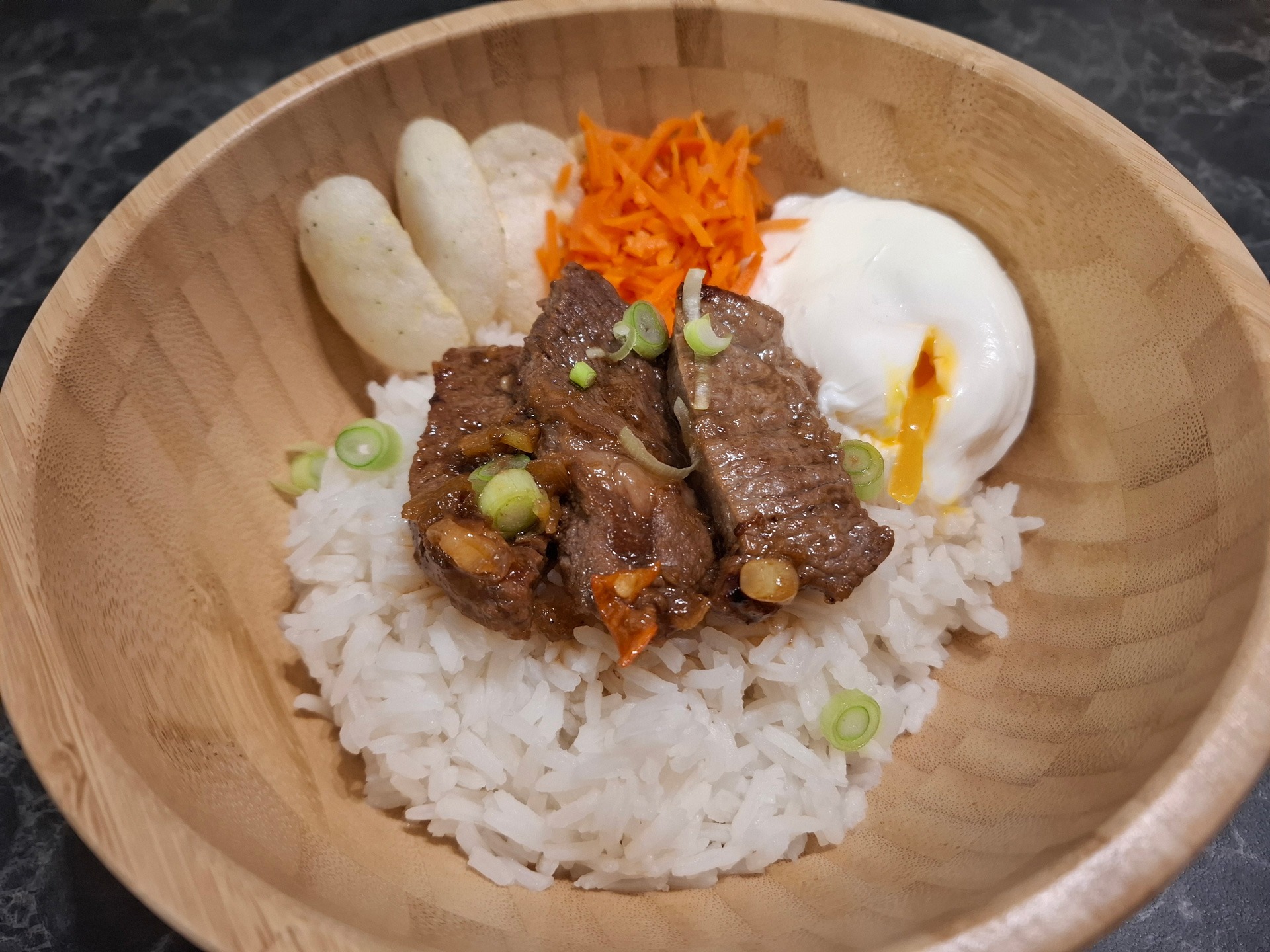 • Serveer de biefstuk in saus op een bedje witte rijst en strooi er de bosui ringetjes overheen. Leg er een gepocheerd ei op en serveer eventueel wat kimchi en kroepoek.