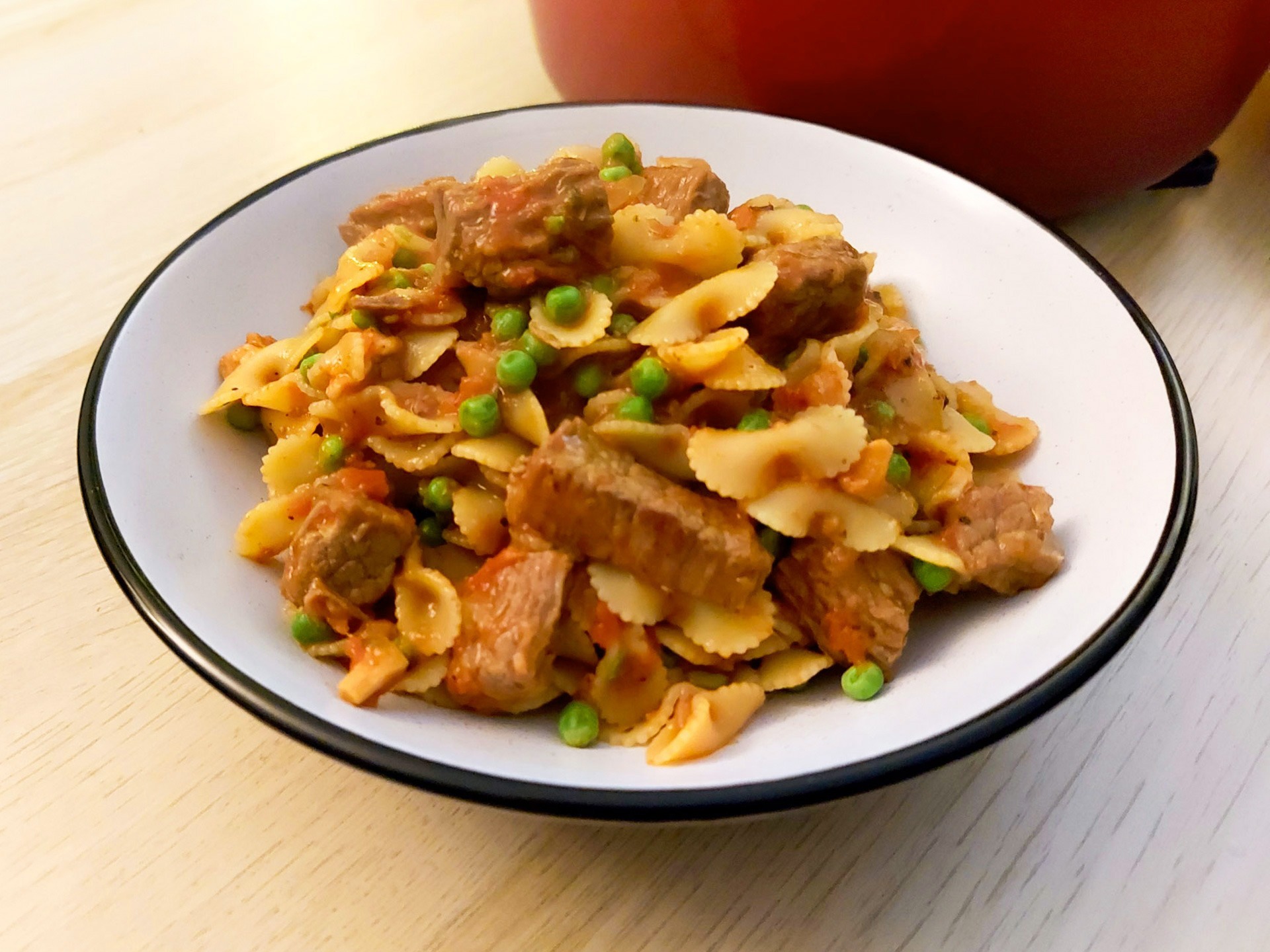 • Breng de saus eventueel verder op smaak en roer de pasta erdoor. Breng opnieuw aan de kook, controleer of er nog genoeg vocht in de pan zit en kook de pasta beetgaar. Voeg 3 minuten voor het einde van de kooktijd de diepvrieserwten toe en roer nogmaals goed door. Verwijder de laurierblaadjes en het kruidenbosje en serveer direct.