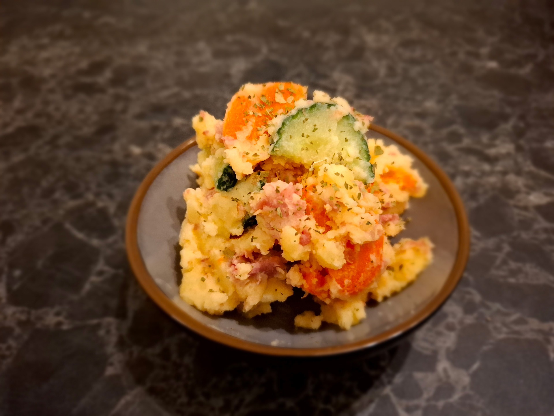 Wanneer de aardappels gaar zijn, giet je de pan af en stamp je de aardappels fijn (gebruik wat melk en boter voor een wat zachtere puree).