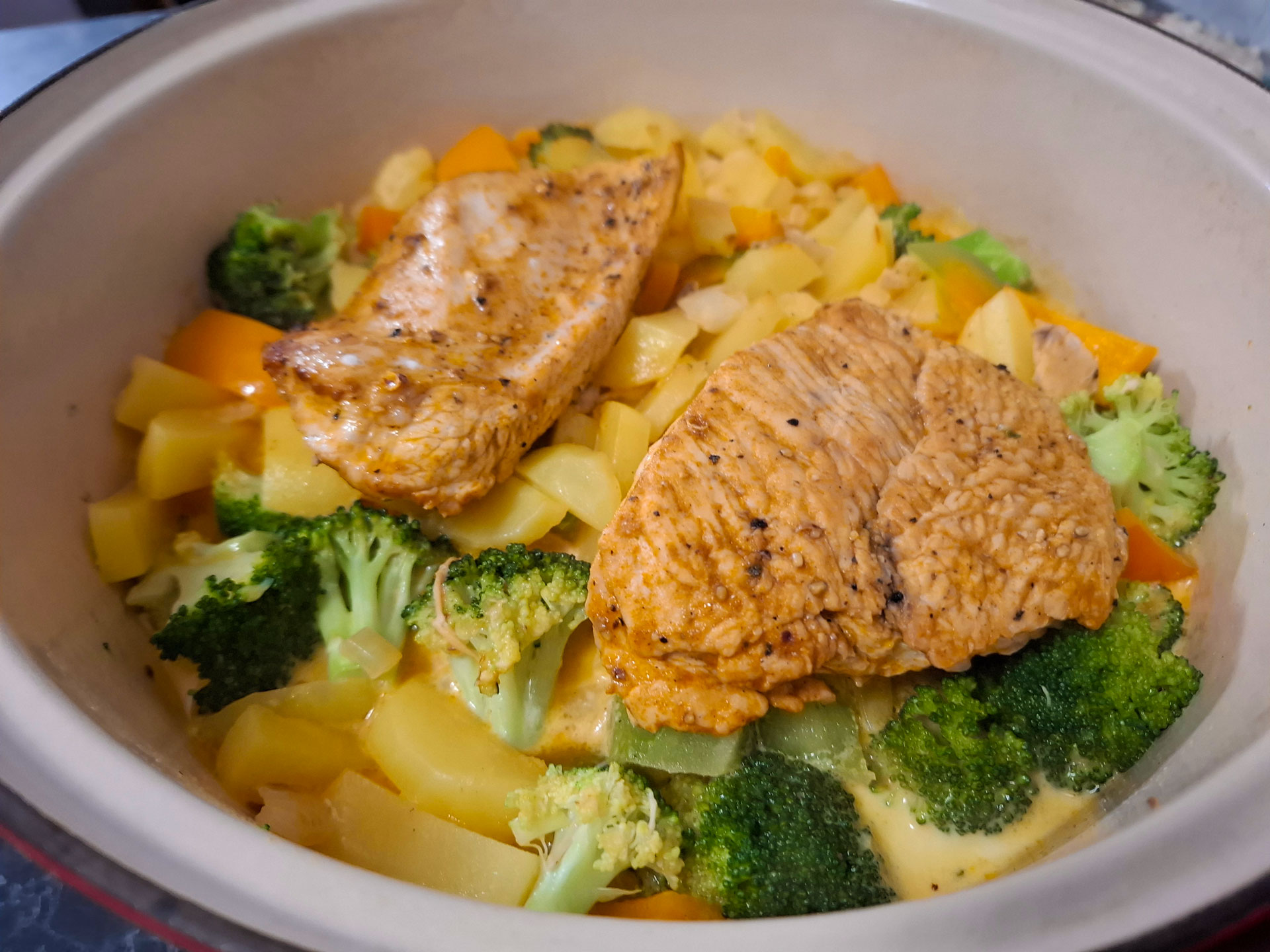 In een grote pan verwarm je de olie en braad de filets in 5 minuten mooi goudbruin. Haal de kalkoenfilets uit de pan.