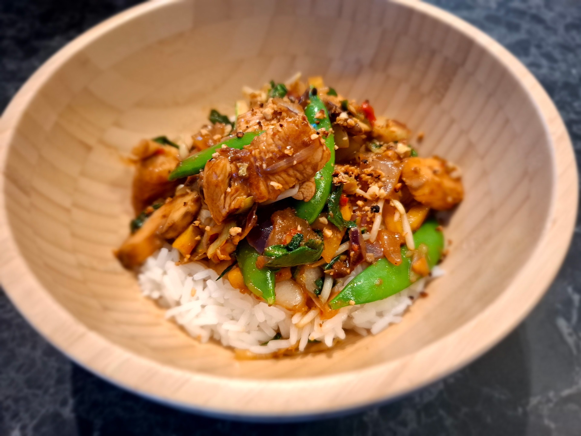 • Voeg de saus toe en roer totdat alle kip bedekt is. Serveer met witte rijst en bestrooi met de geroosterde pinda’s.