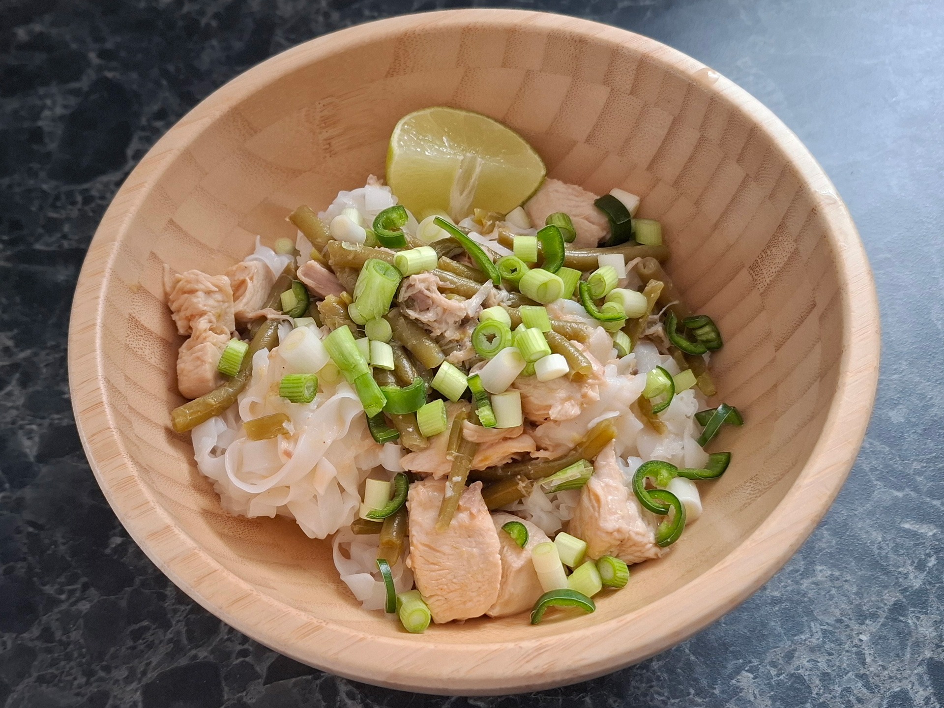 - Snijd ondertussen de bosui in ringetjes, de limoen in partjes en de peper in ringetjes. Kook ondertussen ook de noedels volgens de verpakking gaar.