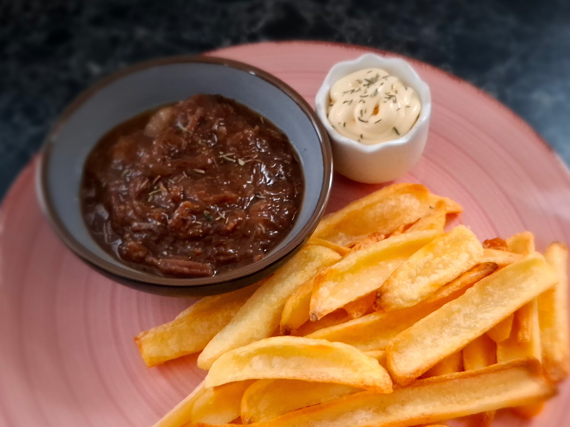 • Verhit de andere helft van de boter in een koekenpan en bak hierin de uien lichtbruin. Doe de uien met het bakvet bij het vlees. Breng aan de kook en laat het vlees afgedekt 2,5 uur zachtjes sudderen. Schep regelmatig het schuim eraf.