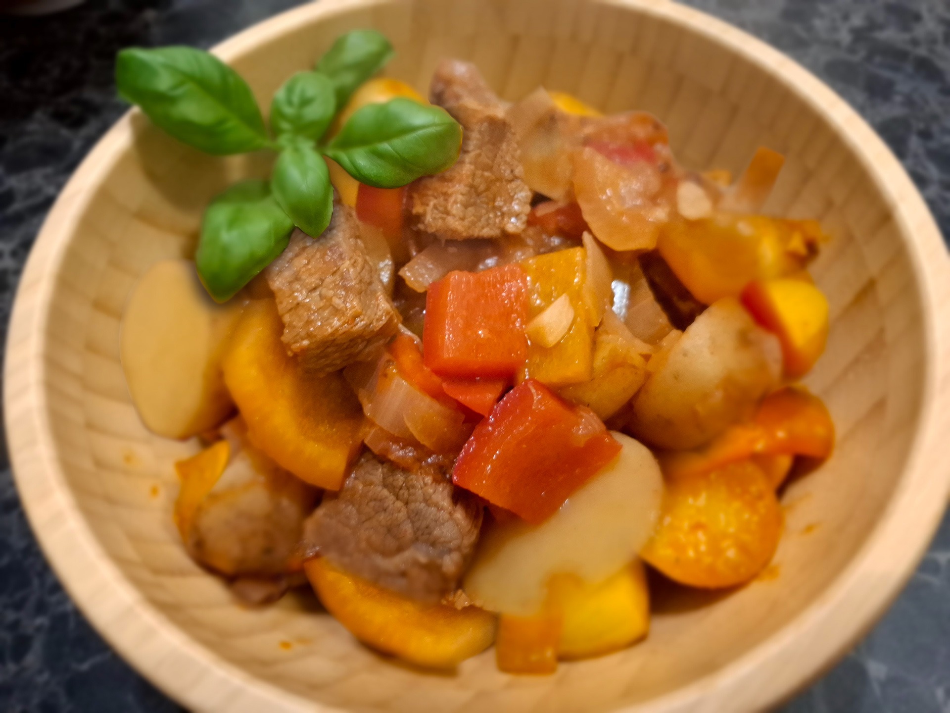 • Snijd de krieltjes eventueel in partjes. Halveer de paprika’s, verwijder de steelaanzet en zaadlijsten en snijd het vruchtvlees in blokjes. Voeg de krieltjes en paprika toe aan het vlees. Schep om en laat de goulash met de deksel schuin op de pan nog 30 minuten stoven. Verwijder de laurierblaadjes uit de pan.