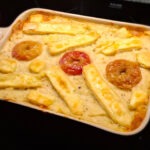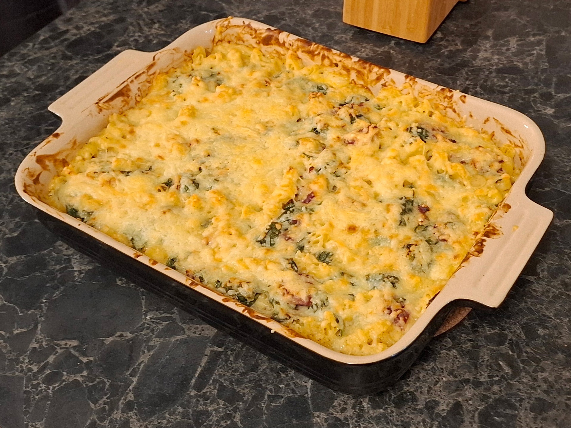 Zet de oven op 200 graden om voor te verwarmen. Vet een ovenschaal in en doe het pasta mengsel hierin. Bestrooi de schotel met de rest van de kaas.
