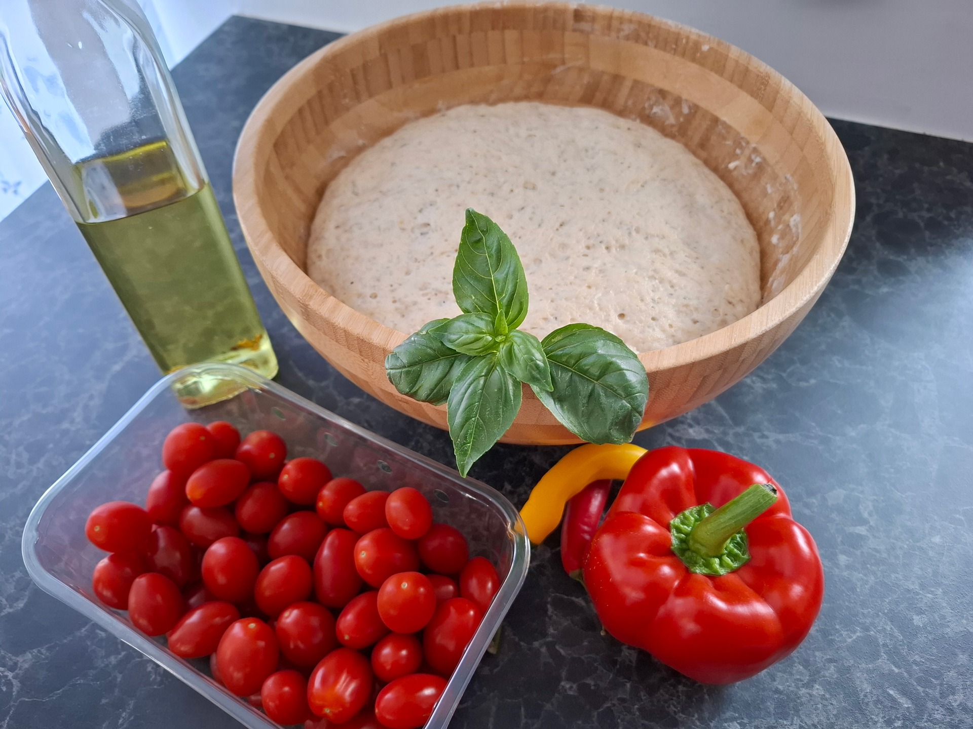 500 gr bloem, 1 zakje gist, 0,5 tl zout, 0.5 tl suiker, droge kruiden naar smaak