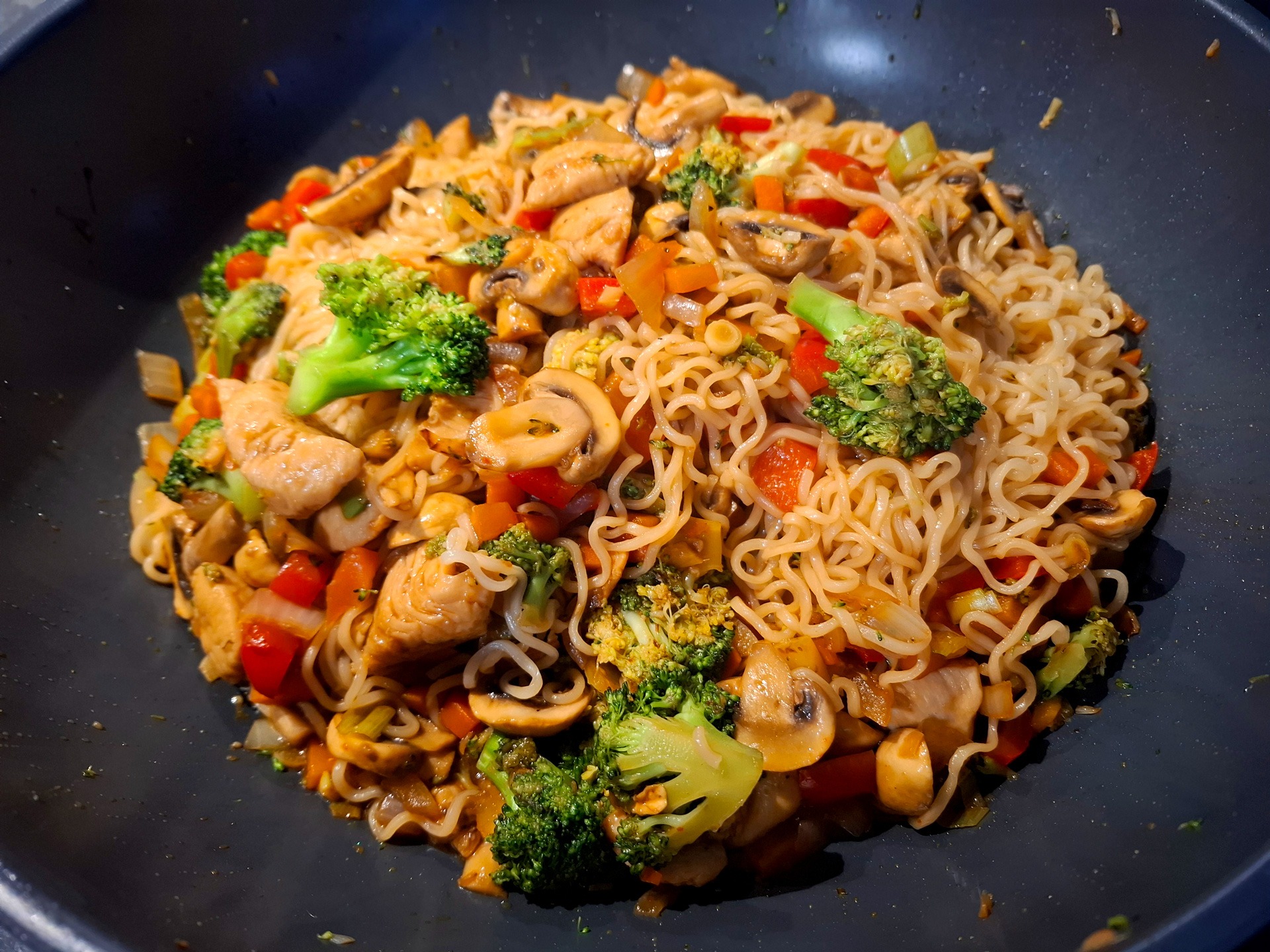 • Giet de woksaus er nu bij en roer goed door elkaar. Kook ondertussen de ramen noedels, goet ze af en spoel ze af met koud water. Voeg een beetje olie toe en schud goed. Voeg de noedels toe aan de wok en meng alles goed door elkaar.