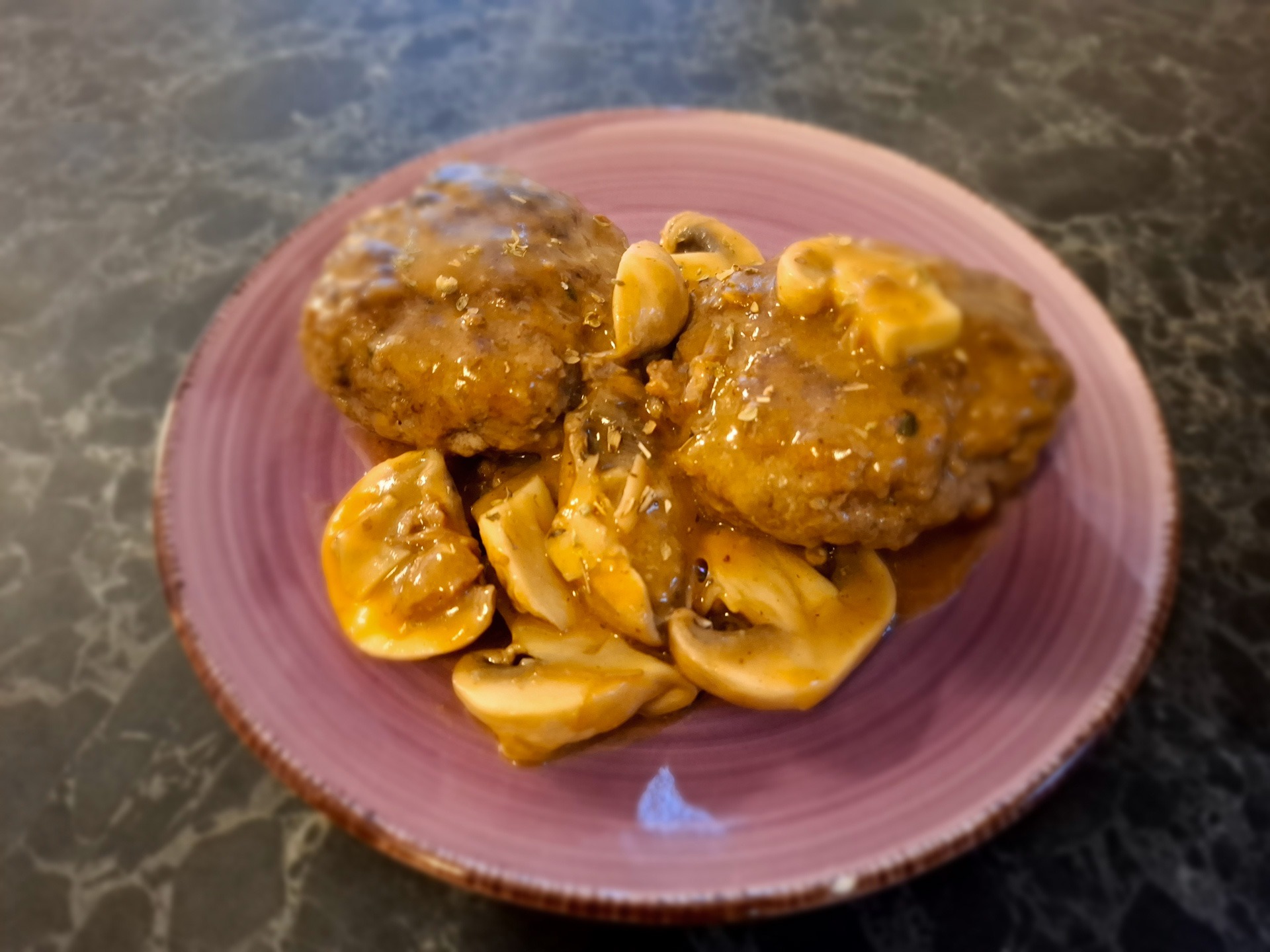 - Doe de gehaktschijven terug in de pan en zorg dat ze goed in de saus liggen. Plaats de deksel op de pan en laat afgedekt nog 10 tot 15 minuten sudderen tot de schijven helemaal gaar zijn.