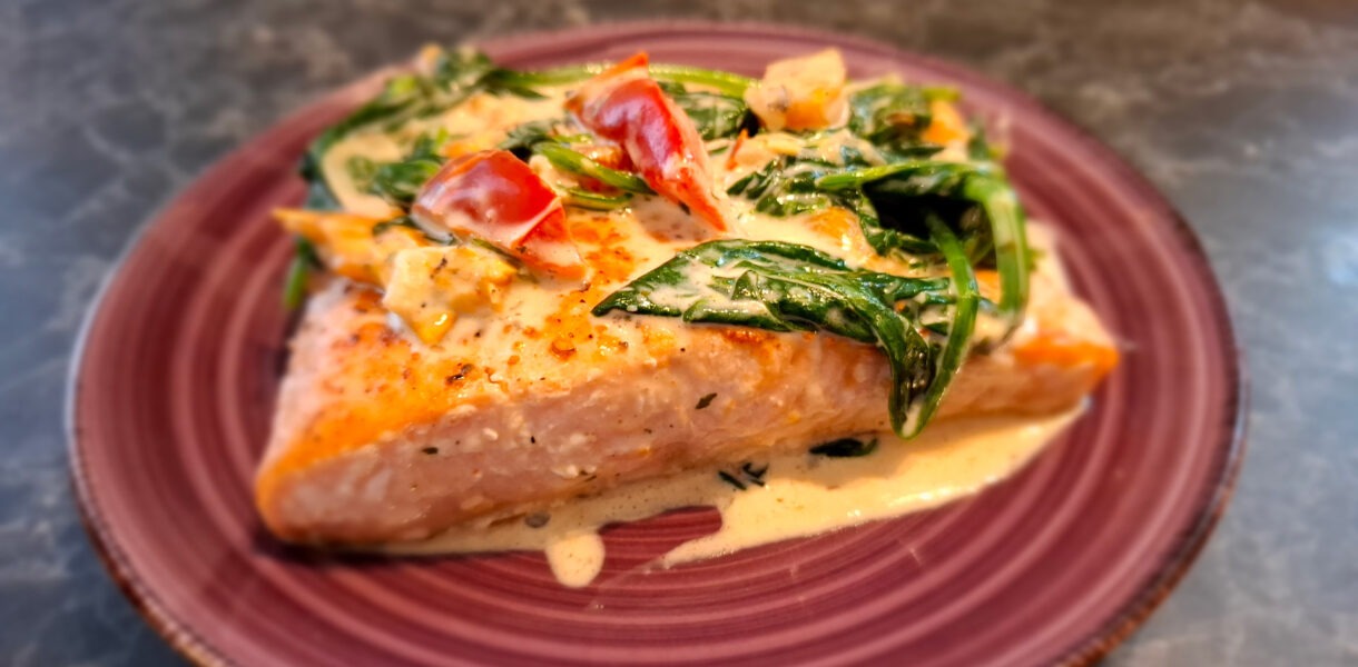 Geüpdatet op maart 17, 2026mei 29, 2025The Seal Meal VisZalmfilet in een gegrilde paprika-spinazie roomsaus