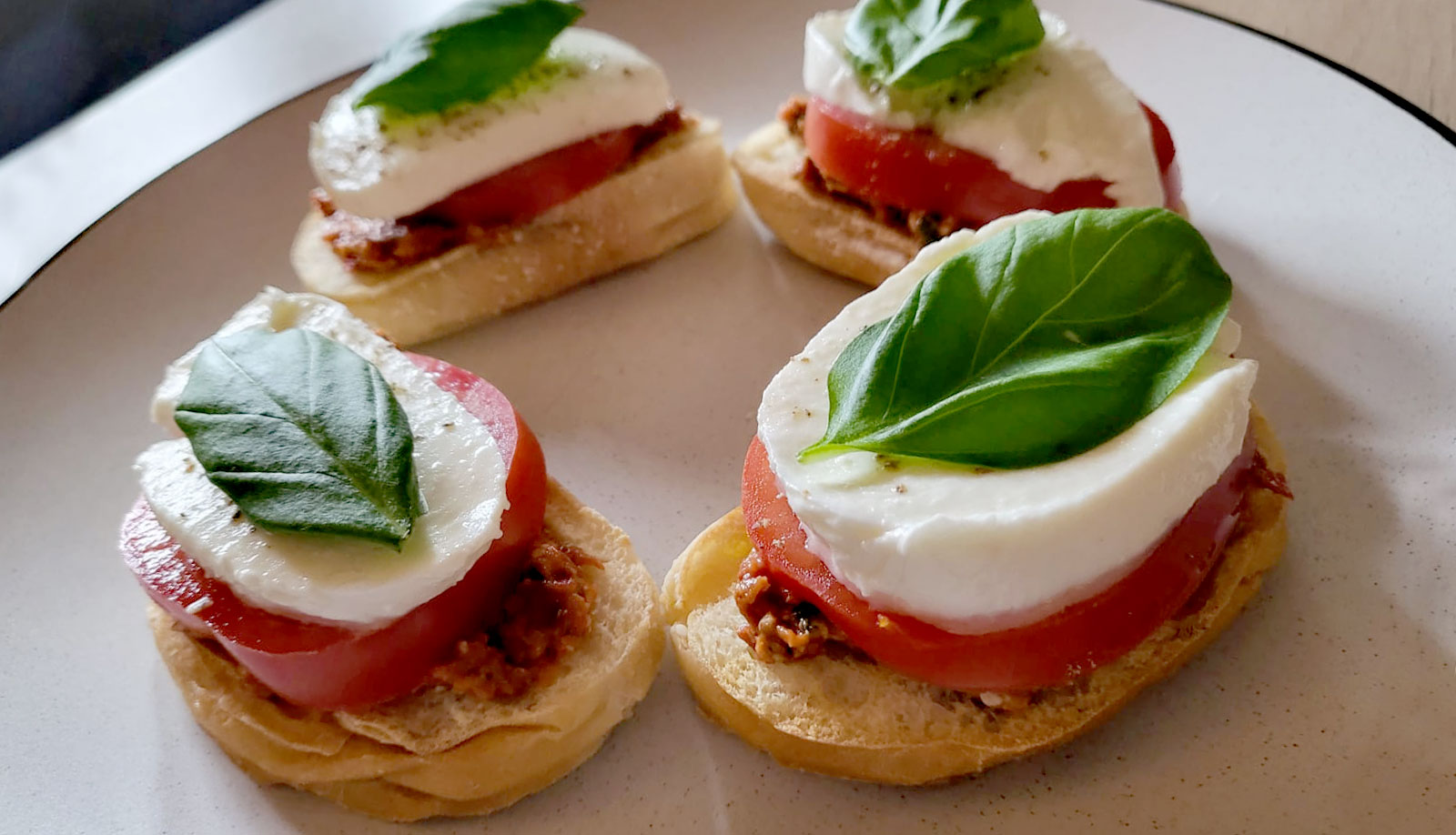 - Beleg de ciabatta stukken met pesto een schijf tomaat, een plakje mozzarella en een vers basilicum blaadje. Bestrooi met een beetje peper en serveer.16 blaadjes verse basilicum, versgemalen peper