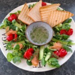 - In een aparte kom meng je de azijn, honing, mosterd, zout, peper en olijfolie. Serveer deze naast de sla over mix het desgewenst al door de salade heen.3 el appelazijn, 1 tl honing, 1 tl mosterd, zout en peper, 3 el olijfolie