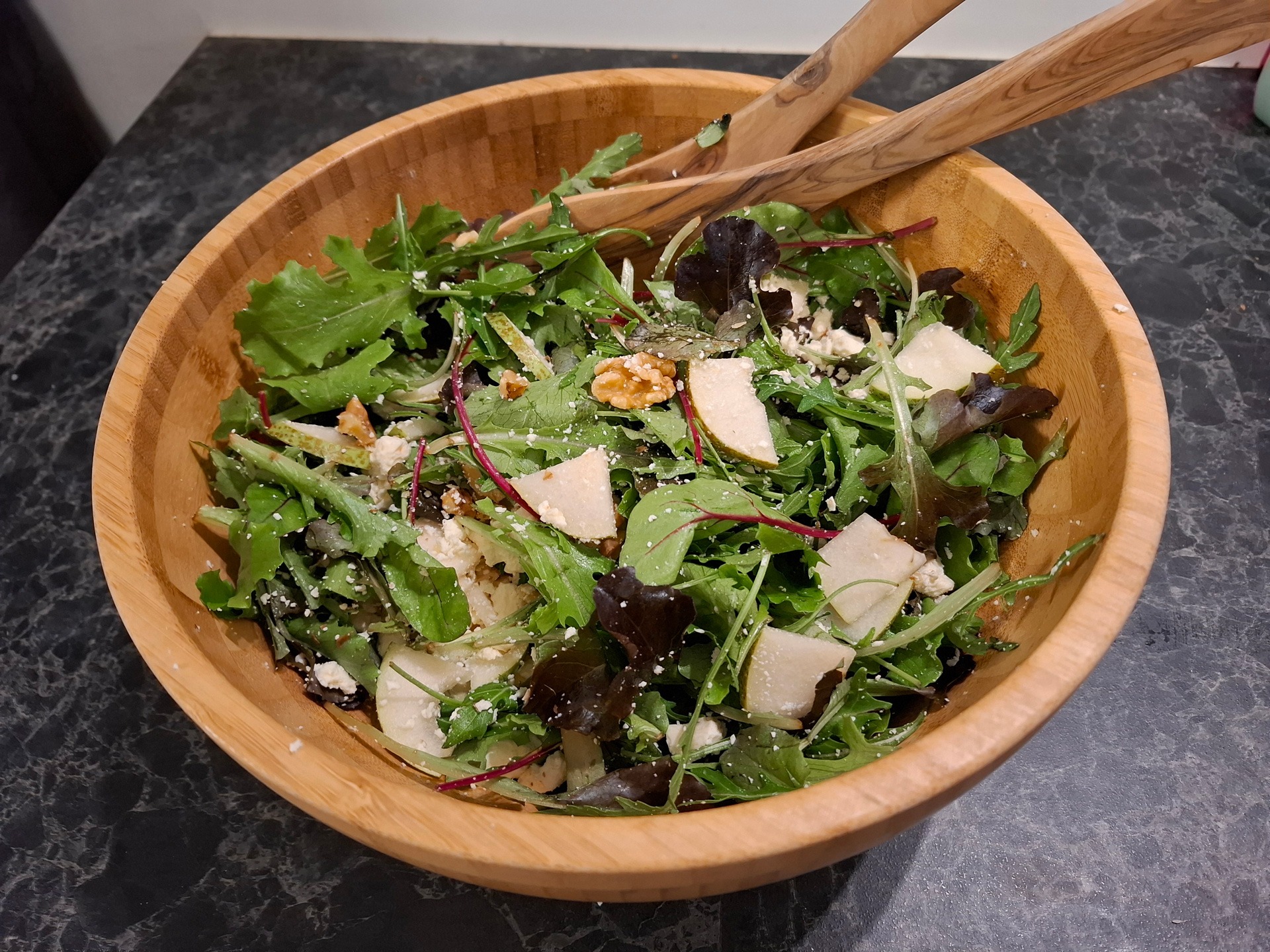 - Was indien nodig de sla en doe deze in een slakom. Was en snijd de peer naar voorkeur en verdeel deze over de sla.250 gr slamix, 1 peer