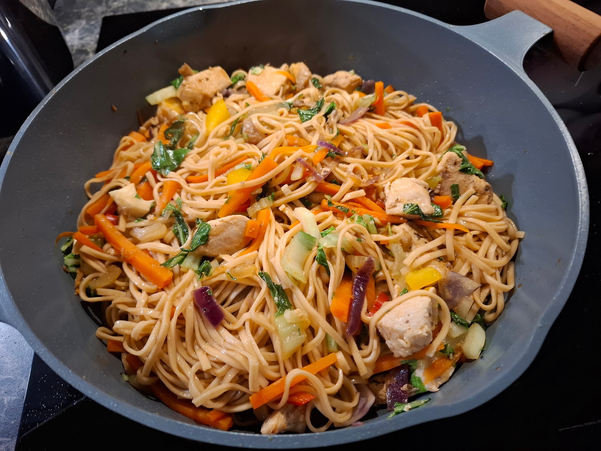 Wanneer de noedels gaar zien giet je ze af en leg je ze bovenop de groenten en kip. Giet nu de zelfgemaakte Yakisoba saus over het geheel en mix alles nog even goed door elkaar.