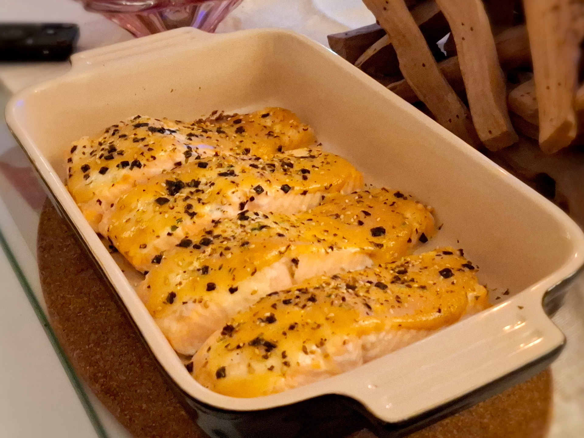 Plaats de overschaal nu in de voorverwarmde oven en bak de zalm, afhankelijk van de dikte van de filets, in 10-12 minuten gaar. Haal de filets uit de oven en serveer meteen.