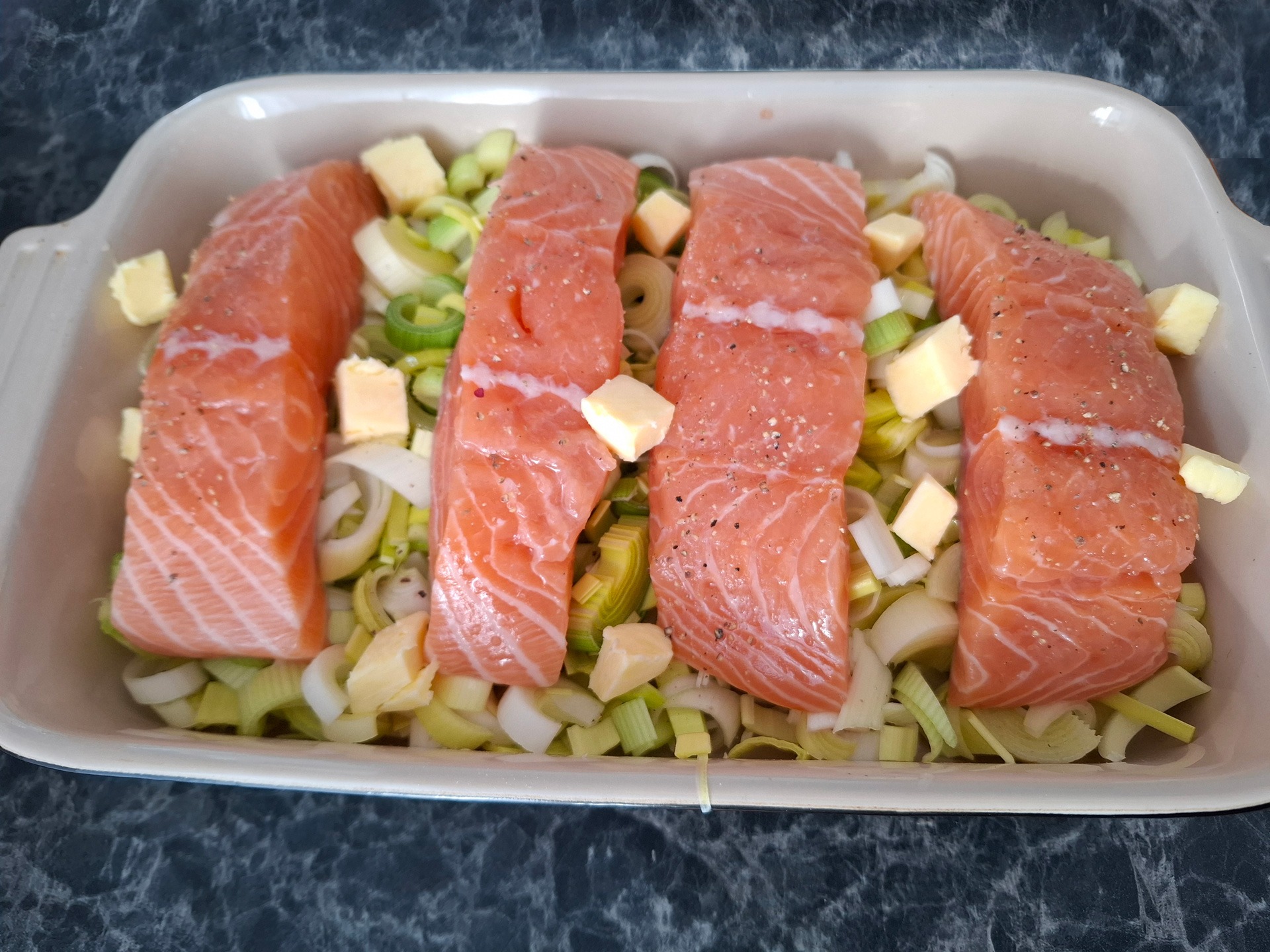 - Bestrooi de zalmfilets met zout en peper en leg ze bovenop de prei. Schenk er een scheut wijn bij, verdeel er klontjes boter over en dek af met aluminiumfolie.20 gr roomboter, 4 zalmfilets zonder huid, zout en peper, 120 ml droge witte wijn