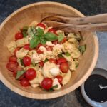 • Voeg nu de lente-uitjes, kaasbolletjes, gehalveerde cherrytomaatjes en naar smaak eventueel olijven en kappertjes toe en hussel het geheel goed door elkaar.