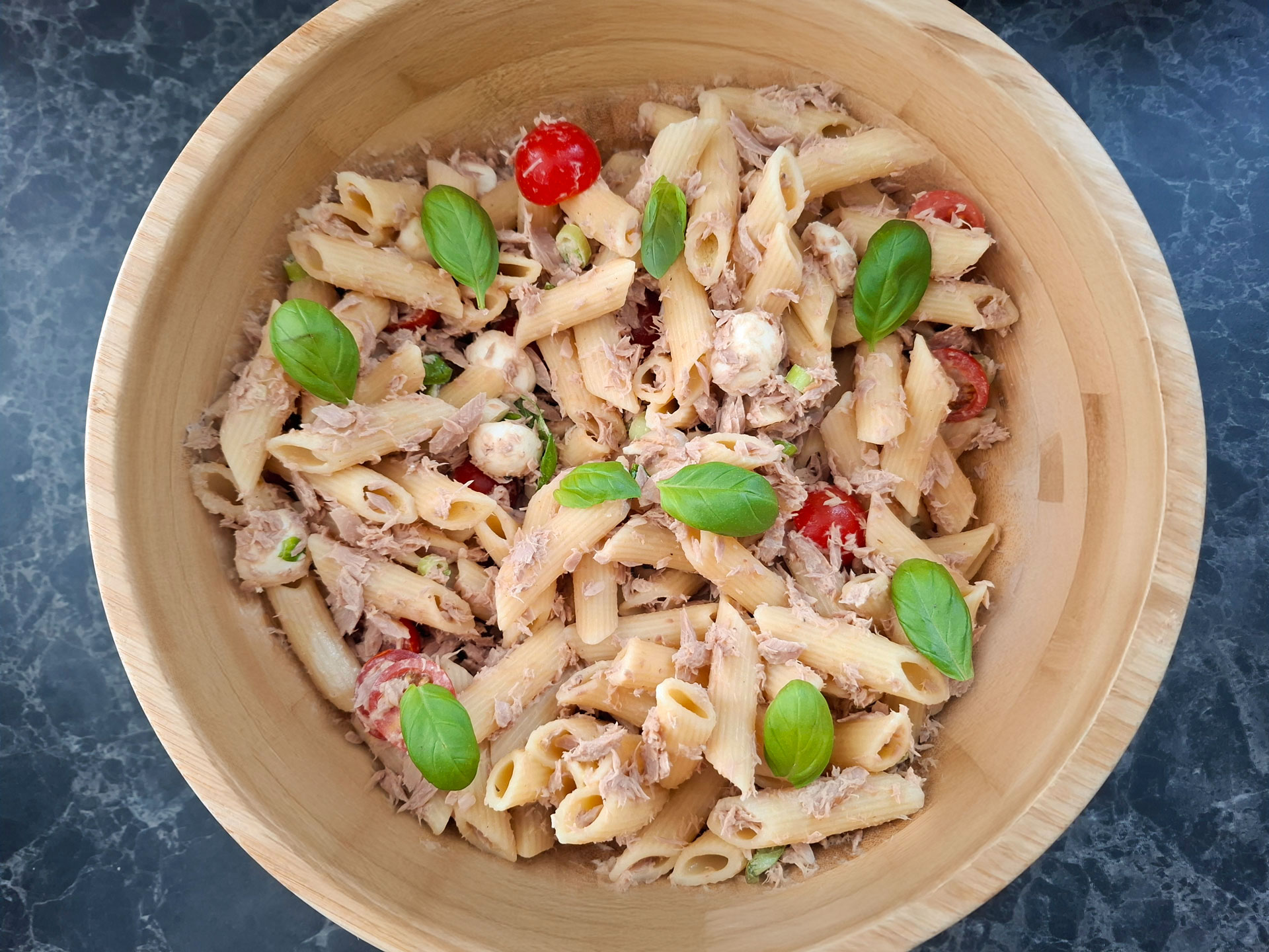 • Giet het vocht van de tonijn af en breek de tonijn in kleinere stukjes boven de kom. Wanneer de pasta is gekookt, giet je hem af en spoel hem af onder de koude kraan. Voeg hierna de pasta toe aan de kom mert de tonijn.