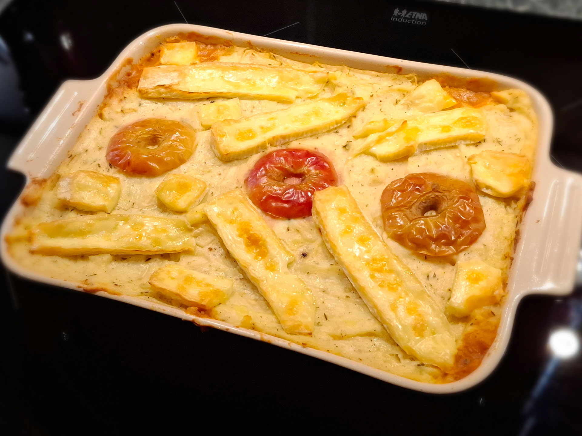 Schep het zuurkoolmengsel in de ovenschaal. Verdeel de aardappel-appelpuree erover. Druk de appelkapjes in de puree. Snijd de brie in plakjes en leg op de puree. Besprenkel met 1 el olie. Bak de zuurkool nu in 30 minuten goudbruin in de voorverwarmde oven.
