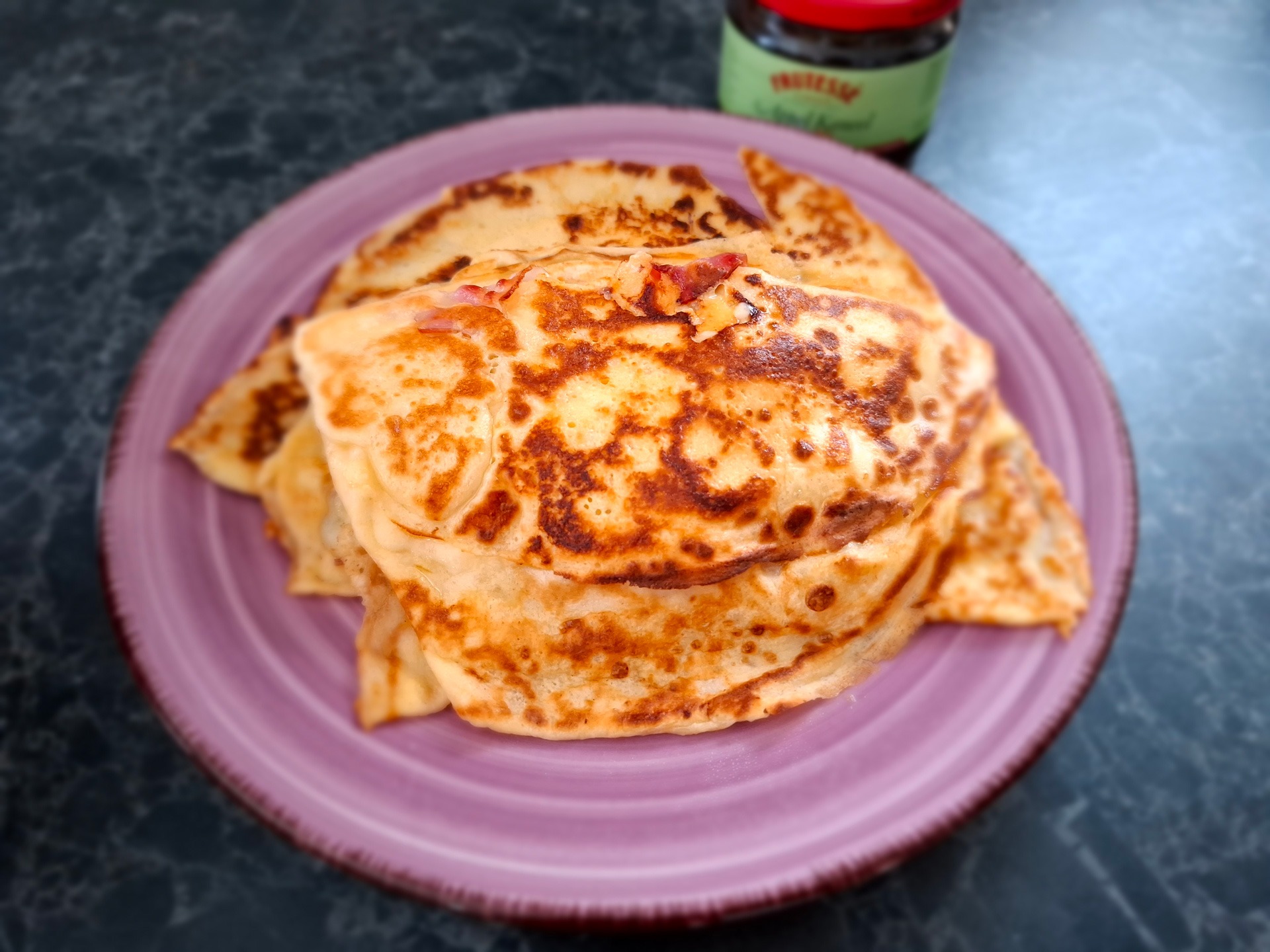 - Smeer een dunne laag frambozenjam of zelfgemaakte frambozenpuree op elke pannenkoek. Je kunt de pannenkoeken oprollen, of opstapelen zoals op de afbeelding bovenaan deze pagina. Garneer de pannenkoeken eventueel met poedersuiker, verse frambozen en honing.poedersuiker, verse frambozen, honing